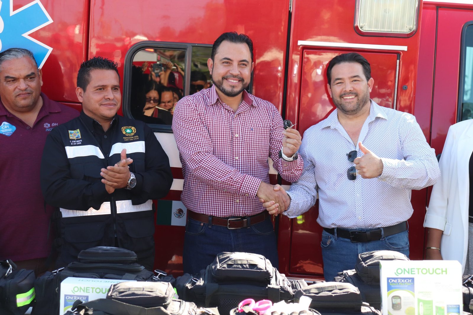 Acompañado por la delegada de Cabo San Lucas, Karina de la O Uribe, Christian Agúndez agradeció a Gilberto Lucero, Jesús Martínez, Ignacio Arce y Martín “El Paisa” por hacer posible la entrega de apoyos, reiterando el compromiso de cuidar la unidad y el equipo para proporcionar atención a la ciudadanía en situaciones de emergencia.