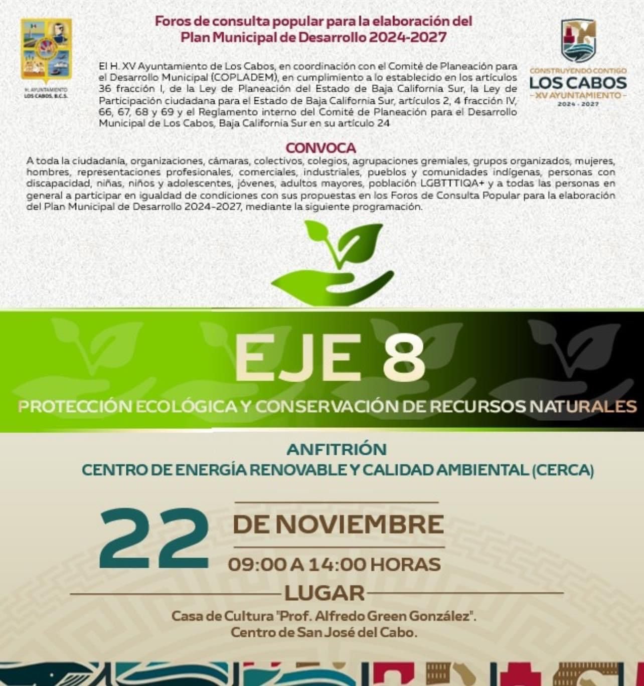 El XV Ayuntamiento de Los Cabos, a través de la Dirección General de Ecología y Medio Ambiente, invita a la ciudadanía a participar en la consulta pública que se llevará a cabo el próximo 22 de noviembre, de 9:00 a 14:00 horas, en la Casa de la Cultura “Profesor Green González”, en San José del Cabo.