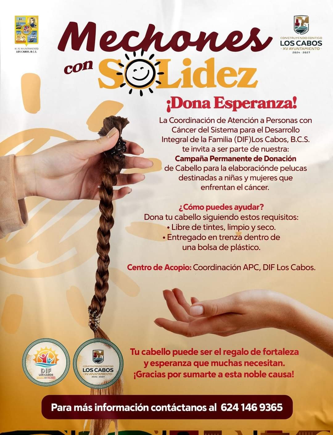 Los Cabos, Baja California Sur. – El Sistema Municipal para el Desarrollo Integral de la Familia (SMDIF) Los Cabos, anunció el inicio de la campaña de donación de cabello denominada “Mechones con Solidez”, programa encabezado por la presidenta Honoraria, Sol Delgado Moreno, mismo que tiene como objetivo la elaboración de pelucas que serán destinadas a niñas y mujeres con padecimiento de cáncer, quienes como consecuencia de tratamientos y técnicas terapéuticas, a menudo, experimentan la pérdida de cabello.