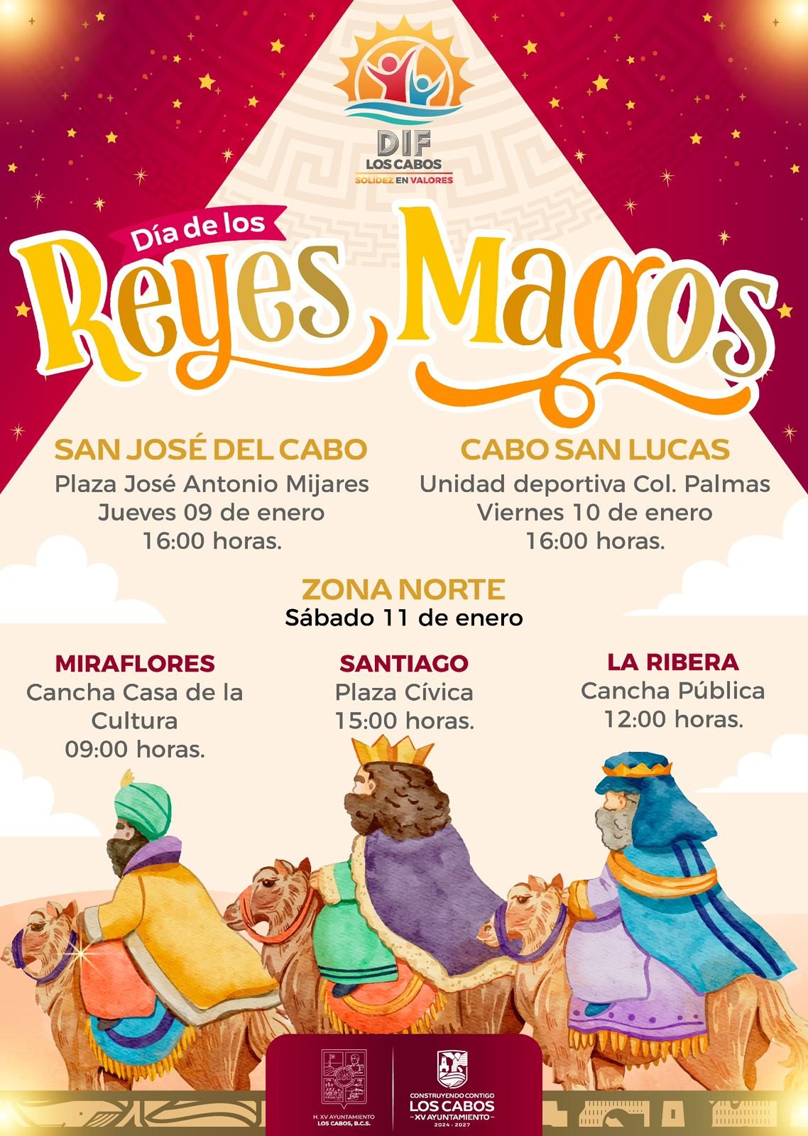 Los Cabos, Baja California Sur. – Con la finalidad de fomentar la cultura y la unión familiar a través de las tradiciones y costumbres, el XV Ayuntamiento de Los Cabos que preside el Arq. Christian Agúndez Gómez, a través del Sistema Municipal para el Desarrollo Integral de la Familia (SMDIF) Los Cabos, invita a la ciudadanía a asistir al festejo del Día de Los Reyes Magos.