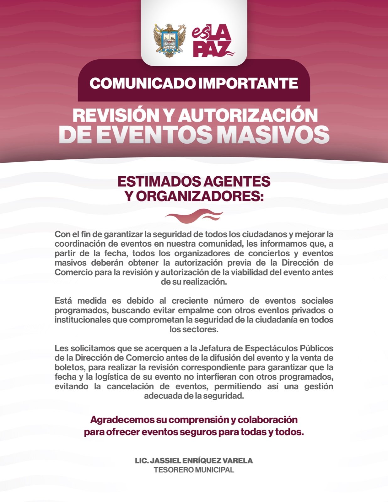 El Ayuntamiento de La Paz informa que a partir de la fecha, todos los organizadores de conciertos y eventos masivos deberán tramitar una autorización previa emitida por la Dirección de Comercio Municipal, para la revisión y autorización de la viabilidad antes de su celebración, así lo dio a conocer el Tesorero Municipal, Jassiel Enríquez Valera.