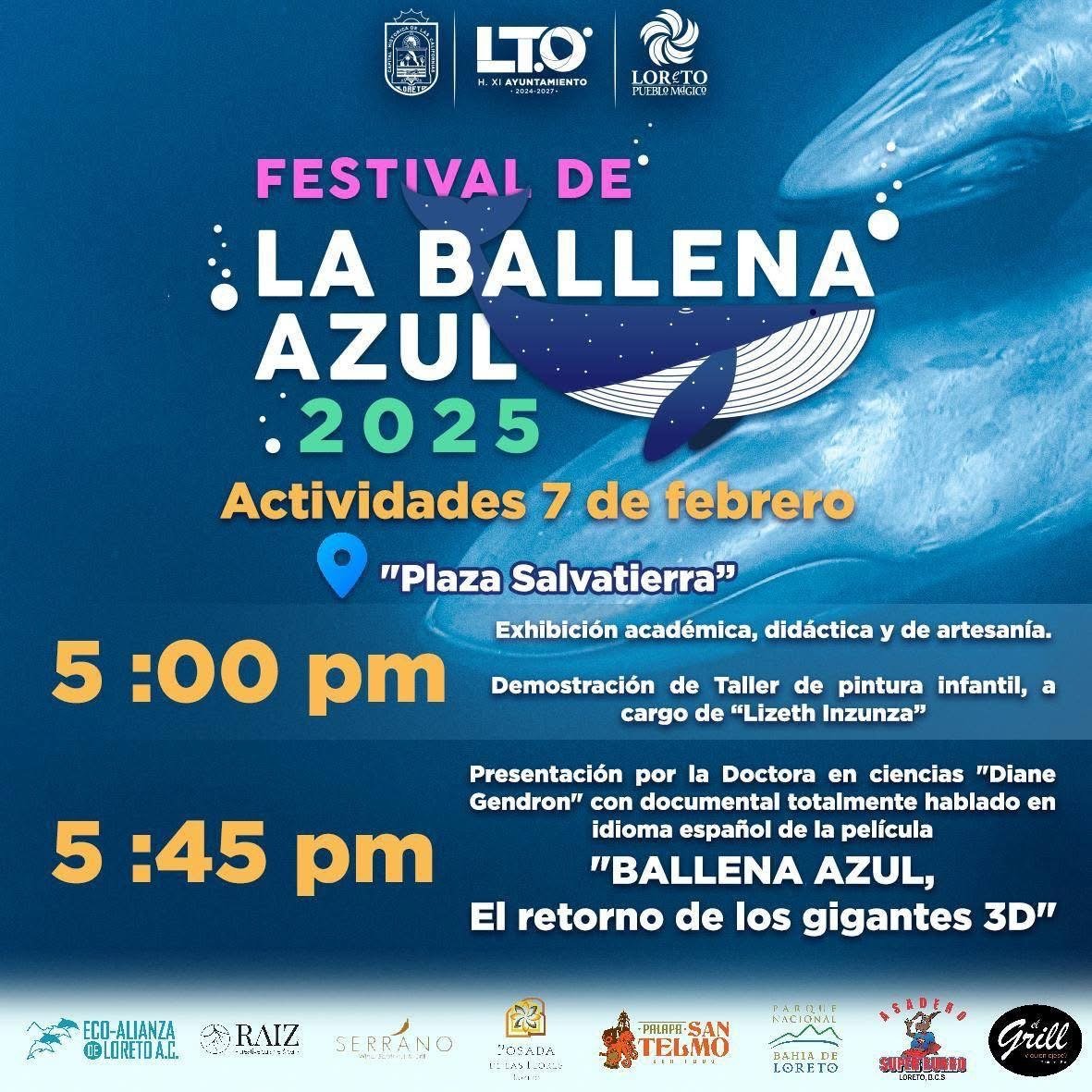 Loreto, B.C.S. 6 de febrero, 2025.-Para celebrar la llegada de este impresionante mamífero marino a las cálidas aguas del Golfo de California, esta tarde inicia “El Festival de la Ballena Azul 2025” el cual se realizará del 6 al 8 de febrero en la plaza “Juan María de Salvatierra” de la ciudad de Loreto.