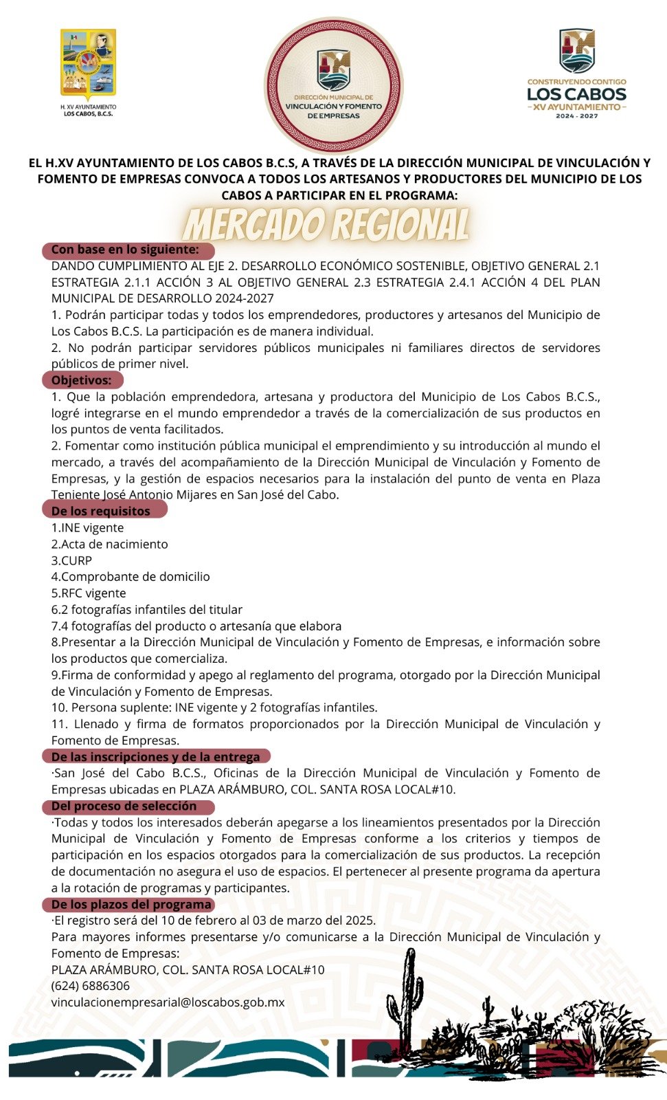 Los Cabos, Baja California Sur.- Con el objetivo de impulsar la cultura y fortalecer la economía local, el XV Ayuntamiento de Los Cabos invita a emprendedores, artesanos y productores del municipio a participar en el programa “Mercado Regional”, a través de la Dirección Municipal de Vinculación y Fomento Empresarial.