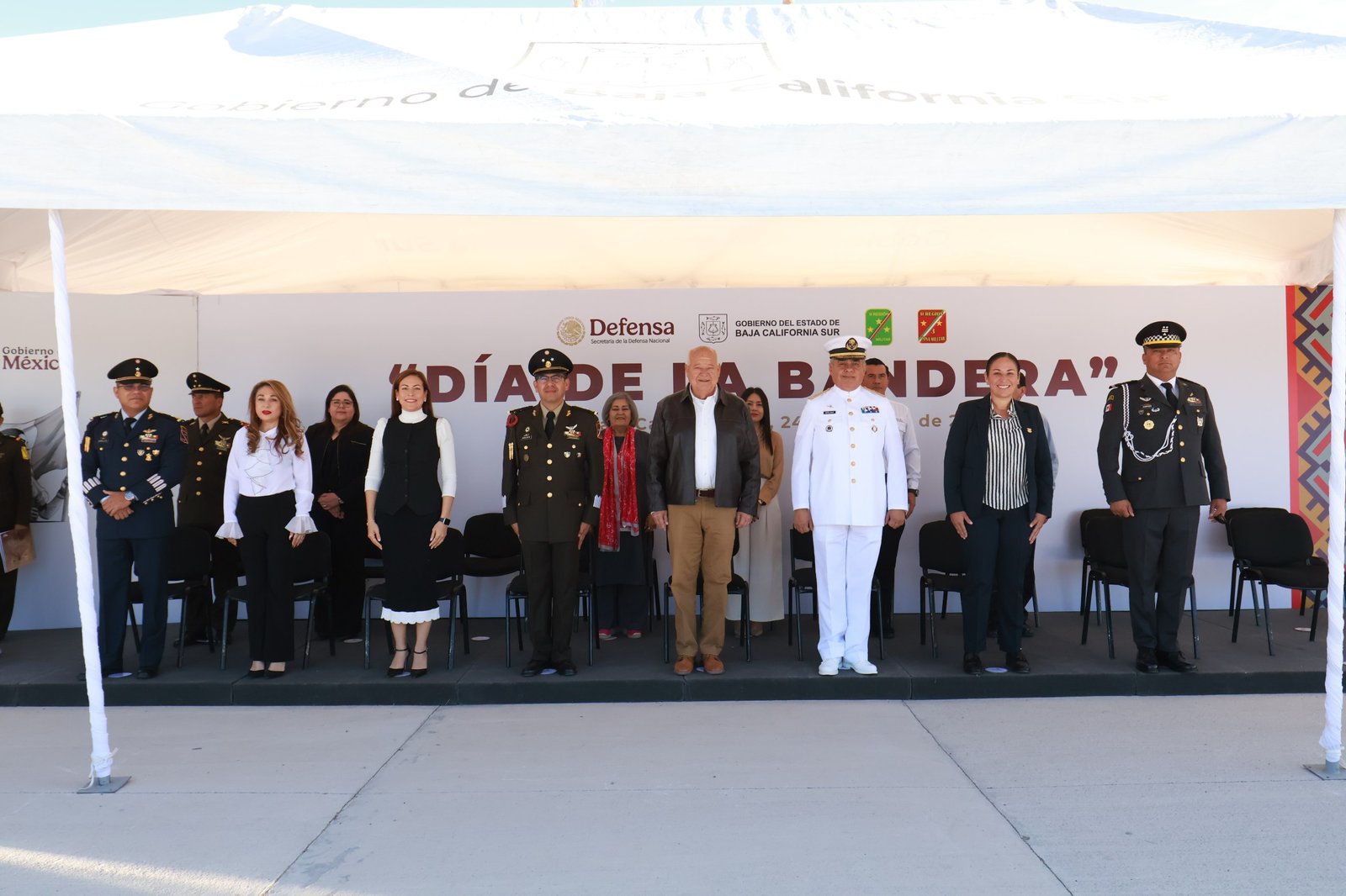 En la ceremonia por el Día de la Bandera también estuvieron presentes las titulares del Poder Legislativo, Alondra Torres García, y del Poder Judicial, Claudia Jeanette Cota Peña, la alcaldesa de La Paz, Milena Quiroga Romero, así como representantes de las Fuerzas Armadas.