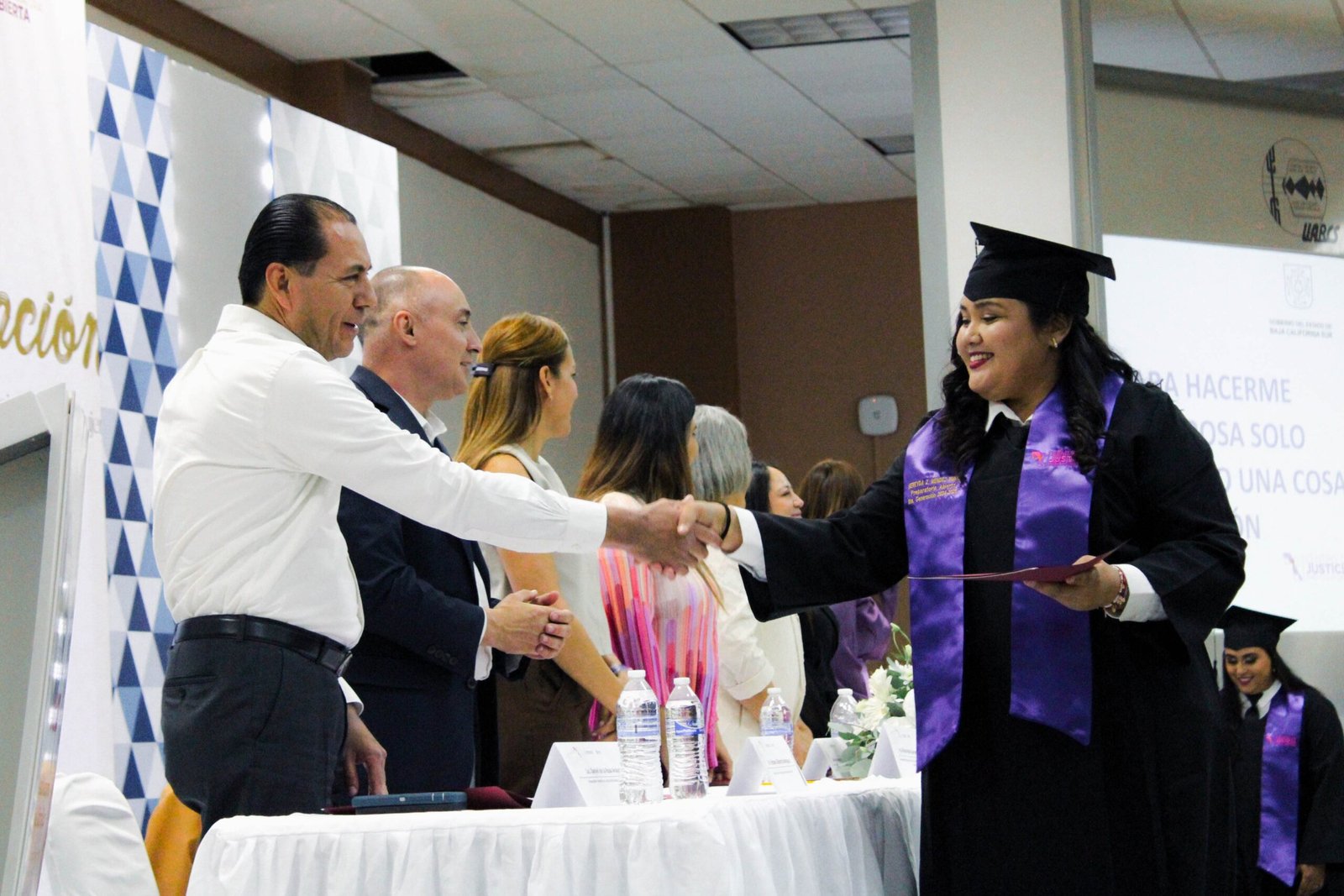 A nombre del jefe del Ejecutivo, Víctor Castro Cosío, Berenice Serrato Flores, directora general del Instituto Sudcaliforniano de las Mujeres, se sumó a las felicitaciones por el gran esfuerzo para estudiar a la par de contar con otras responsabilidades.