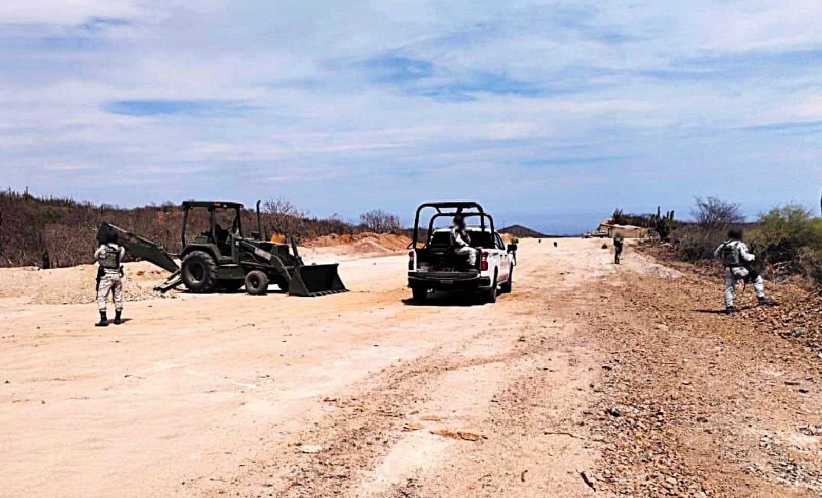 El cateo se llevó a cabo con el apoyo de elementos de la Policía Federal Ministerial (PFM), del Centro Federal Pericial Forense (CFPF), ambos de la Agencia de Investigación Criminal (AIC), Secretaría de la Defensa Nacional (Defensa), Guardia Nacional (GN) y Procuraduría General de Justicia del Estado, donde se aseguró el predio acondicionado como presunta pista de aterrizaje, cuatro escopetas, 90 cartuchos y 40 casquillos.