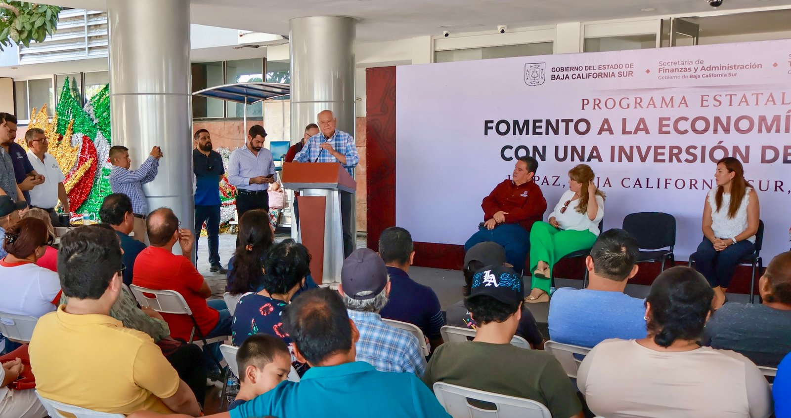 En este acto estuvieron presentes la alcaldesa de La Paz, Milena Quiroga Romero; el titular del Fondo de Desarrollo Social, Guillermo Álvarez Gámez; y la secretaria de Turismo y Economía, Maribel Collins Sánchez, quien destacó que uno de los objetivos prioritarios del gobierno es promover una economía incluyente, que impulse la prosperidad compartida mediante programas sociales que generen oportunidades para todas y todos.