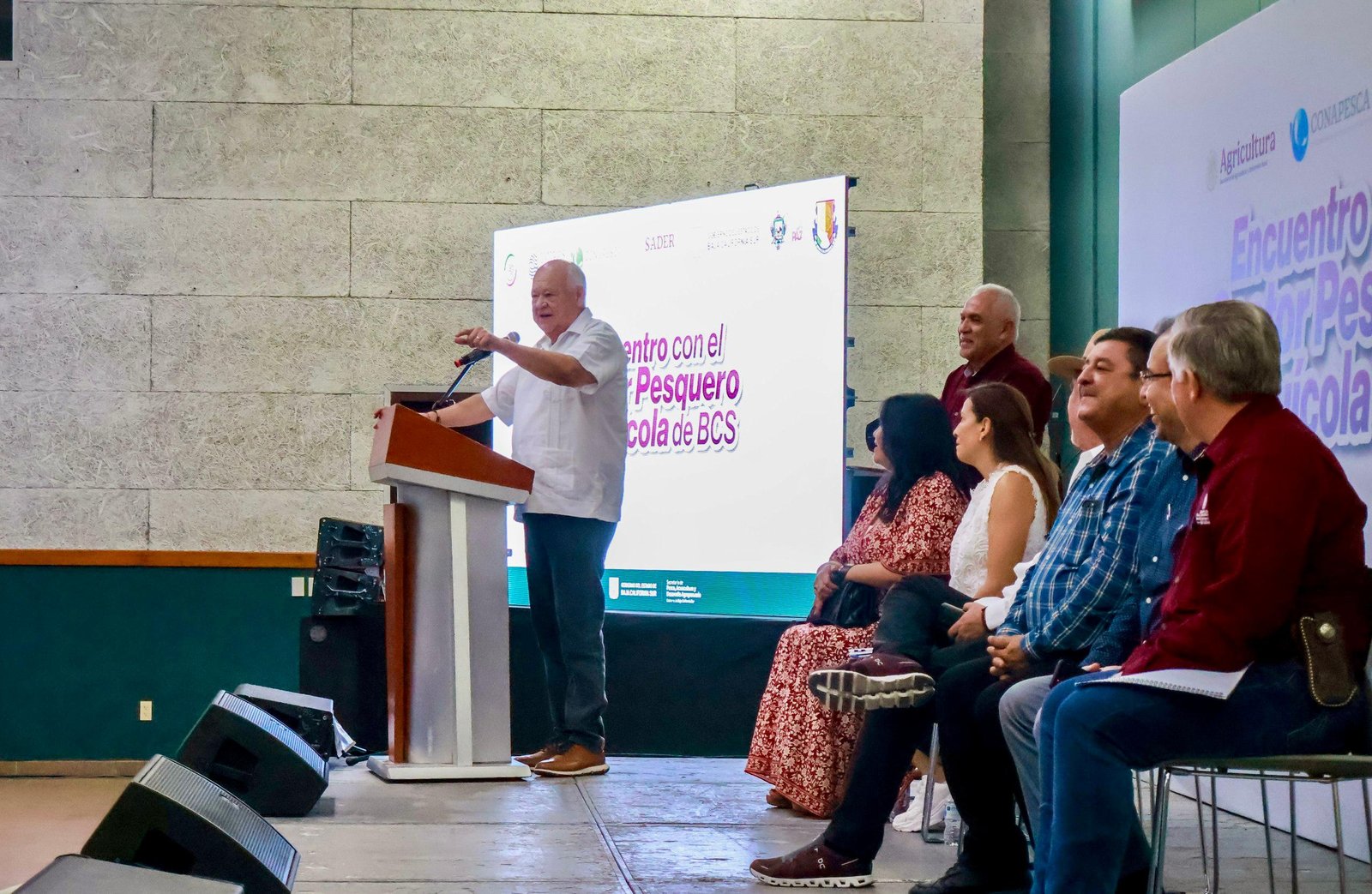 El Gobernador Víctor Manuel Castro Cosío y el titular de CONAPESCA, Rigoberto Salgado Vázquez, junto con Milena Quiroga Romero, alcaldesa de La Paz, encabezaron encuentro con el sector pesquiero y acuícola