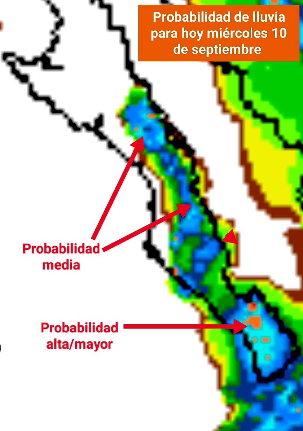 Los Cabos, Baja California Sur.- El Área de Monitoreo y Alertamiento de la Dirección Municipal de Protección Civil, con información del Servicio Meteorológico Nacional (SMN) de Conagua, da a conocer el pronóstico de lluvias para hoy 10 de septiembre en el municipio de Los Cabos.