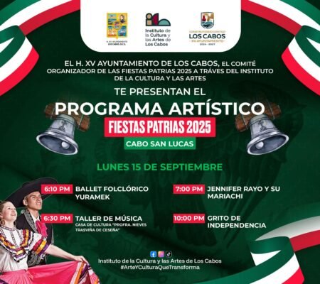 Los Cabos, Baja California Sur.- El XV Ayuntamiento de Los Cabos invita a toda la ciudadanía a disfrutar de los festejos con motivo de las Fiestas Patrias 2025, que se llevarán a cabo este lunes 15 de septiembre en la cabecera municipal y en las diferentes delegaciones.