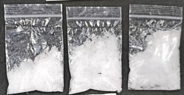 Los agentes policiales realizaron una inspección en la que localizaron al interior del vehículo tres bolsas de plástico que contenían una sustancia cristalina y granulada, la cual resultó ser clorhidrato de metanfetamina, con un peso de 73 gramos 33 miligramos; además, aseguraron una báscula gramera y cinco billetes de cien pesos cada uno.