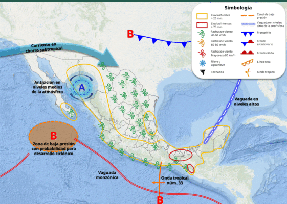 El Servicio Meteorológico Nacional (SMN) informó que una combinación de sistemas atmosféricos —entre ellos la onda tropical número 33, el monzón mexicano y dos zonas de baja presión con probabilidad de desarrollo ciclónico, una frente a las costas de Oaxaca y otra al suroeste de Baja California Sur— ocasionará lluvias, viento y oleaje elevado en territorio sudcaliforniano durante las próximas horas.