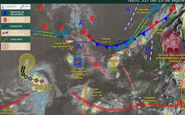Por otro lado, el huracán Narda se mantiene lejos de costas nacionales y ya no representa riesgo directo para Baja California Sur, aunque seguirá generando oleaje elevado en la región.