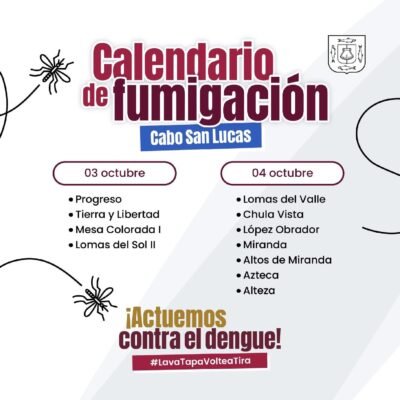 Los Cabos, Baja California Sur.– El XV Ayuntamiento de Los Cabos, que preside Christian Agúndez Gómez, en coordinación con la Secretaría de Salud del Gobierno de Baja California Sur, informa que del 03 al 10 de octubre se desarrollará la segunda etapa de las jornadas de fumigación contra el mosquito transmisor del dengue en Cabo San Lucas. El viernes 03 de octubre será en las colonias El Progreso, Tierra y Libertad, Mesa Colorada I y Lomas del Sol III.