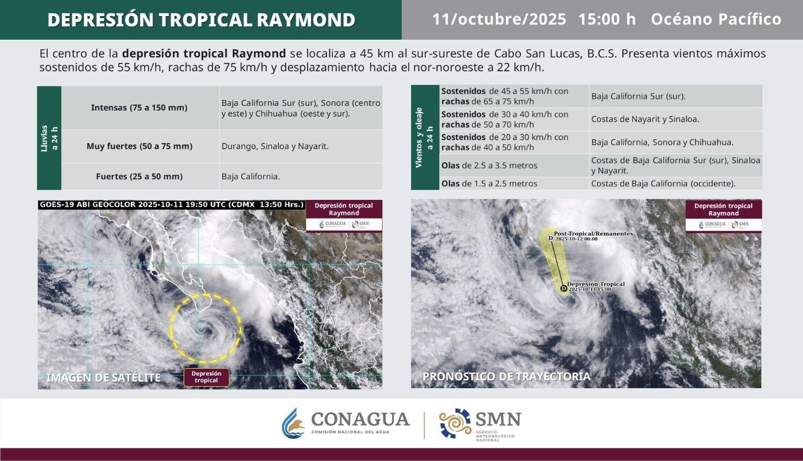 La Paz, BCS, 11 de octubre de 2025.– La Comisión Nacional del Agua (CONAGUA) y el Servicio Meteorológico Nacional (SMN) informaron que el centro de la Depresión Tropical Raymond se localiza a 45 kilómetros al sur-sureste de Cabo San Lucas, Baja California Sur, con vientos máximos sostenidos de 55 km/h, rachas de hasta 75 km/h y un desplazamiento hacia el nor-noroeste a 22 km/h sobre el Océano Pacífico.