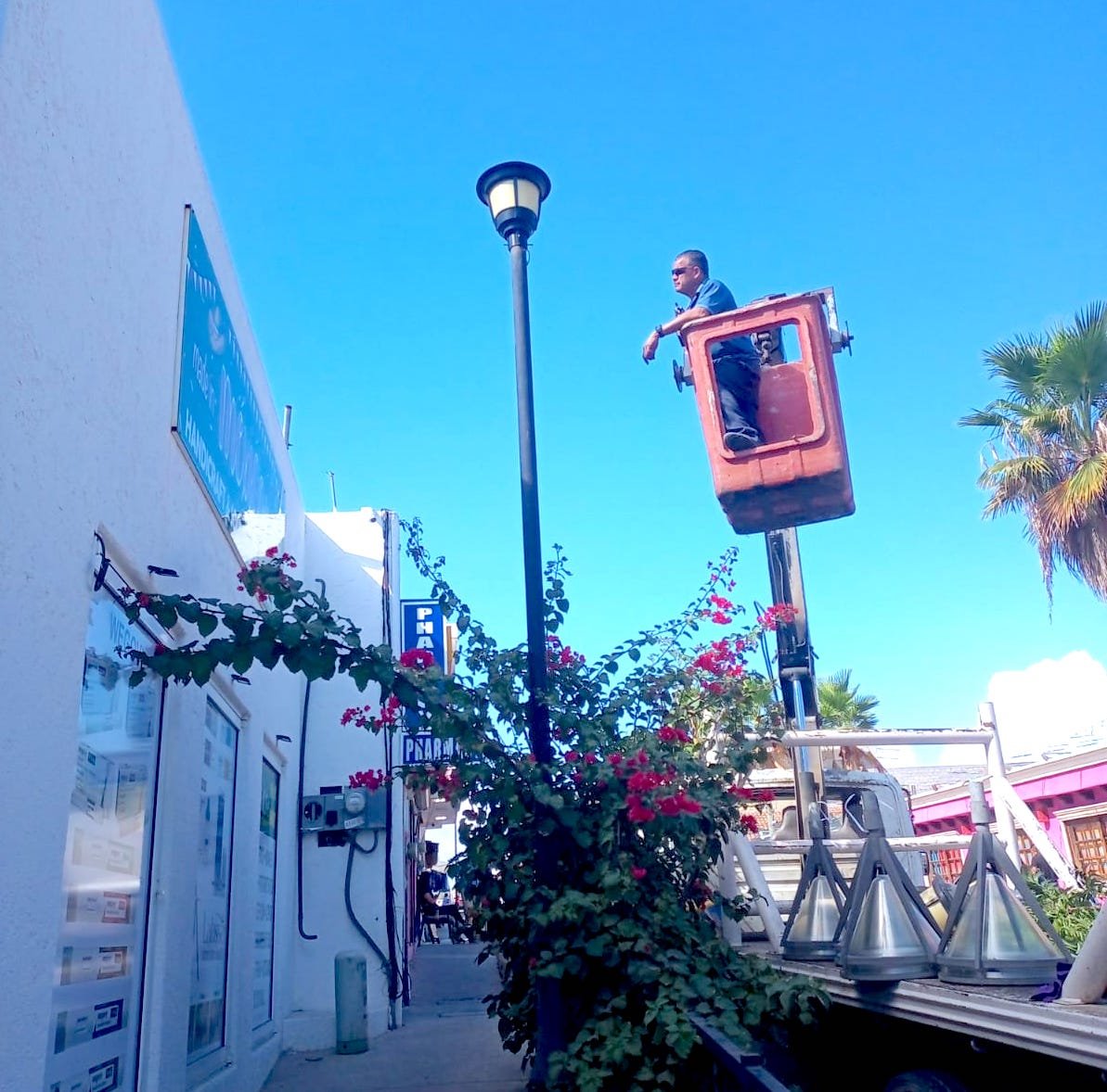 De igual manera, frente a la Delegación de Cabo San Lucas se realizó la soldadura de un brazo metálico y la instalación de tres lámparas LED de 108 watts, retirando las anteriores de 100 watts. En la avenida San Antonio, bulevar del Hospital General se realizó el cambio de ocho luminarias LED, optimizando la eficiencia energética y la visibilidad en ese importante acceso vial.