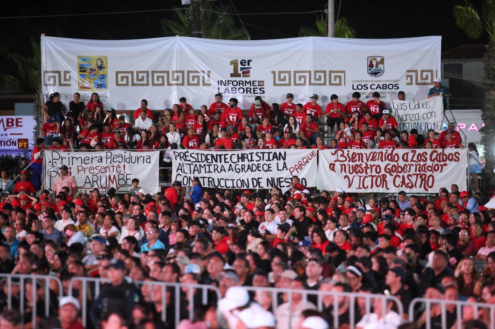 Los Cabos, Baja California Sur.– 14 de noviembre, 2025.- Con la convocatoria a continuar unidos en la transformación de Los Cabos el presidente municipal, Christian Agúndez Gómez destacó en su mensaje del Primer Informe de Labores la obra pública, los apoyos asistenciales y el constante respaldo de la presidenta Claudia Sheainbaum Pardo, así como el gobernador Víctor Castro Cosío además destacó los resultado en materia de obra pública, inclusión social, seguridad y la reafirmación en el ámbito turístico del destino.