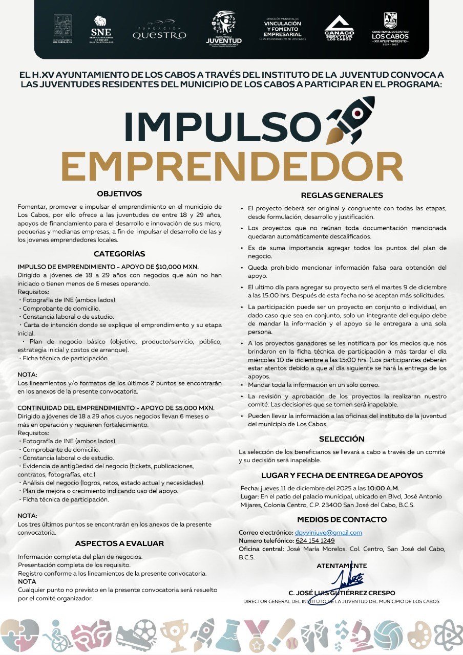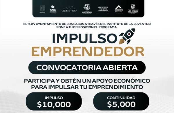 Los Cabos, Baja California Sur.- El XV Ayuntamiento de Los Cabos, a través del Instituto de la Juventud (INJUVE), convoca a las y los jóvenes del municipio a participar en el programa “Impulso Emprendedor”, una iniciativa orientada a fortalecer el talento, la creatividad y el crecimiento económico liderado por juventudes de 18 a 29 años.