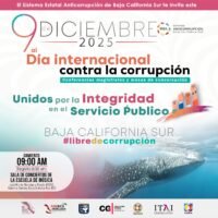 Con un ciclo de conferencias magistrales, el Sistema Estatal Anticorrupción de Baja California Sur conmemorará este martes 9 de diciembre el Día Internacional contra la Corrupción, abordando temas relacionados a la lucha contra la corrupción, ética, responsabilidades administrativas, entre otros.