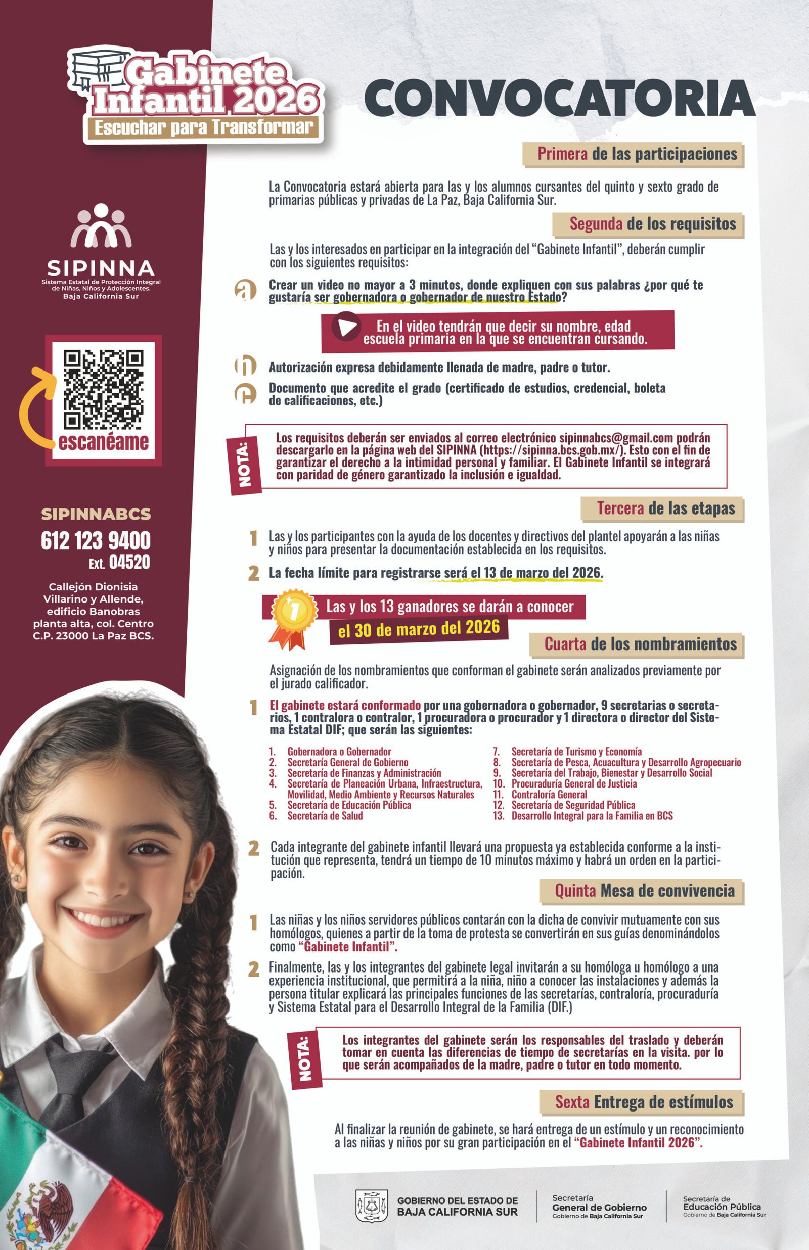 La Secretaría General de Gobierno, mediante el Sistema Estatal de Protección Integral de Niñas, Niños y Adolescentes (SIPINNA), invita a estudiantes de quinto y sexto grado de primaria del municipio de La Paz a participar en la tercera edición del Gabinete Infantil 2026: “Escuchar para transformar”.