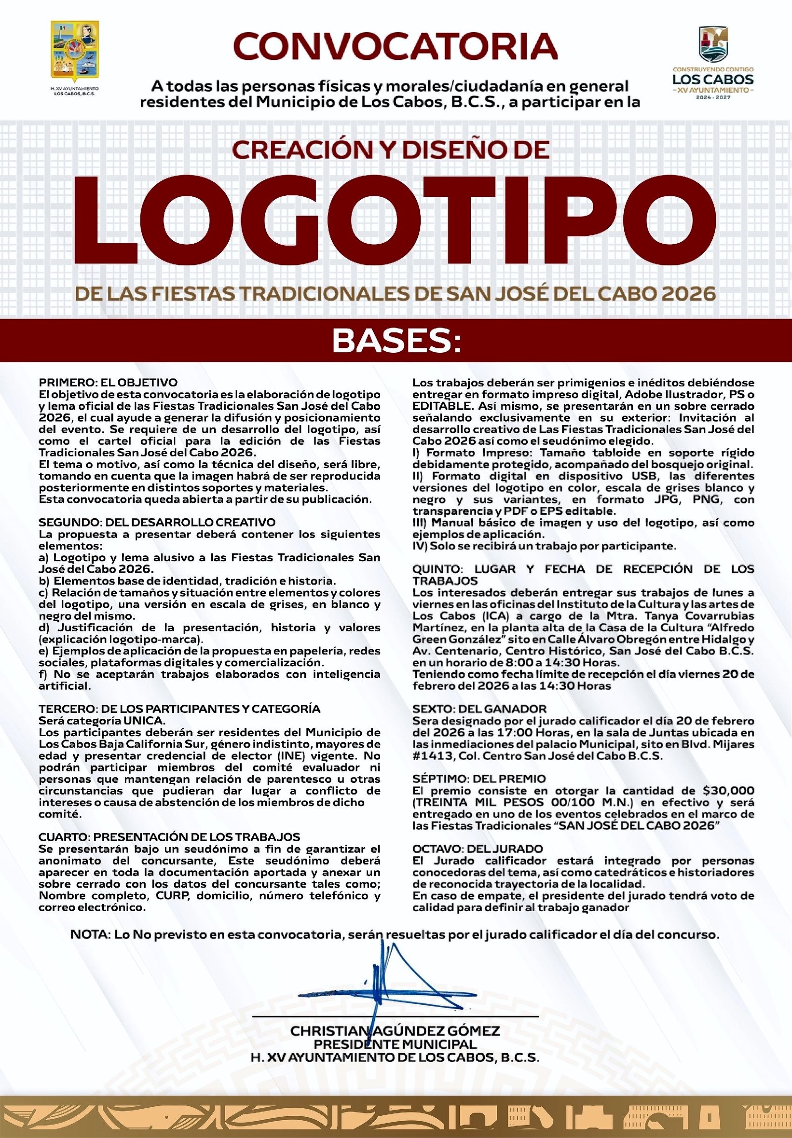 Los Cabos, Baja California Sur.– El XV Ayuntamiento de Los Cabos y del Comité Organizador de las Fiestas Tradicionales San José del Cabo 2026, emiten la convocatoria pública para la creación y diseño del logotipo oficial de estas festividades, invitando a participar a personas físicas, morales y población en general del municipio.