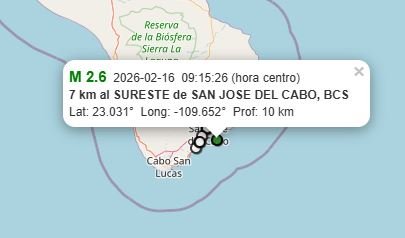 Los Cabos, BCS, a 16 de febrero del 2026.- El Sistema Sismológico de Nacional confirmó este lunes 16 de febrero un sismo magnitud 2.6 con epicentro a a 7 km del noroeste San José del Cabo en punto de las 09:15:26 (hora centro de México).