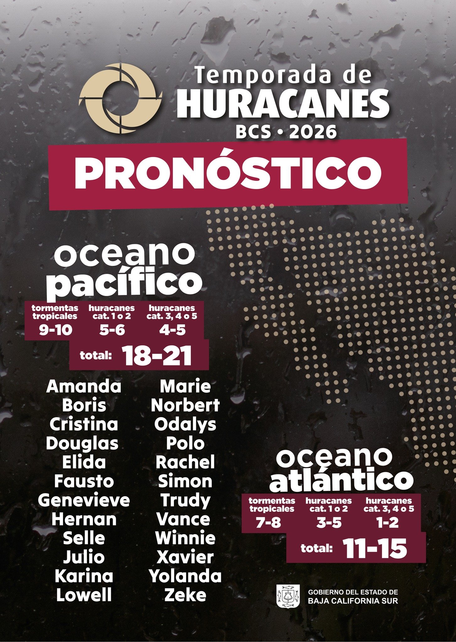 La Paz, BCS, a 23 de abril del 2026.- El Servicio Meteorológico Nacional de México dio a conocer el pronóstico para la Temporada de Lluvias y Ciclones Tropicales 2026, la cual comenzará el próximo 16 de mayo, con expectativas de actividad tanto en el océano Pacífico como en el Atlántico.